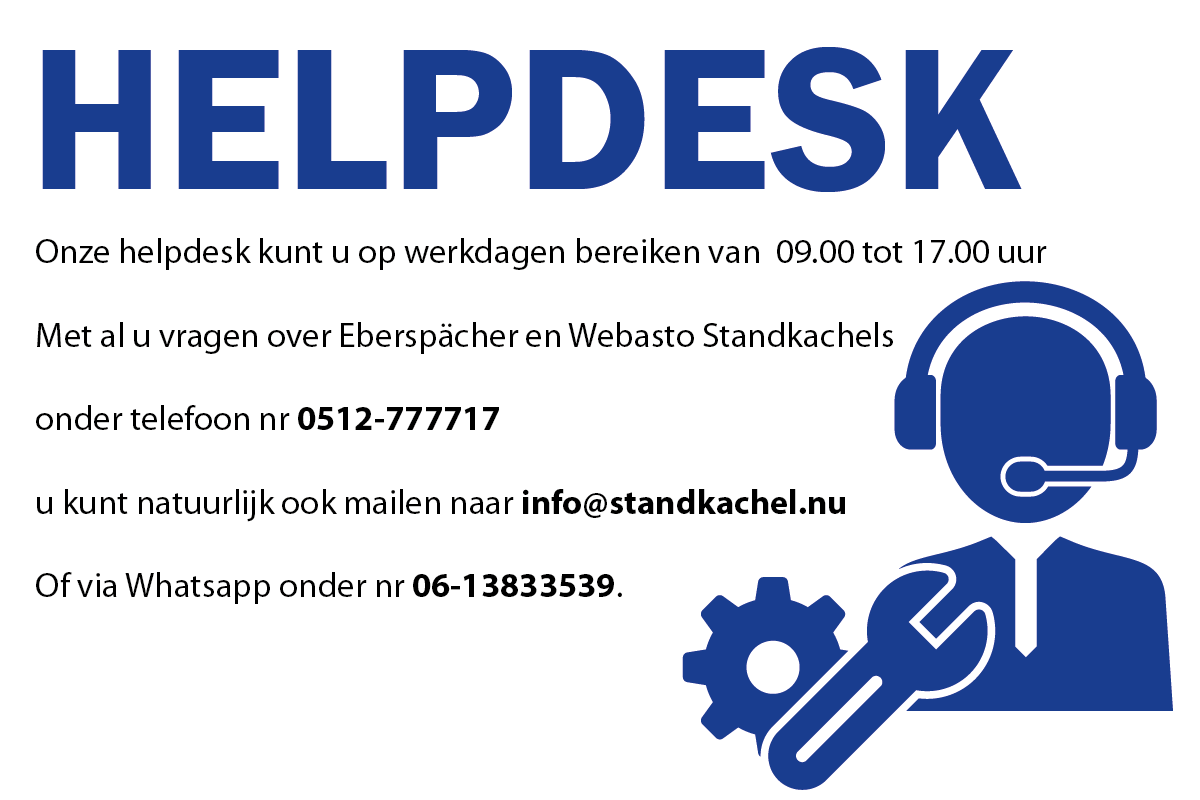 De Helpdesk kunt u  nu op werkdagen bereiken van  09.00 uur tot 17.00 Met al u vragen over Eberspächer en Webasto Standkachels onder telefoon nr 0512-777717 u kunt natuurlijk ook mailen naar info@standkachel.nu Of via Whatsapp onder nr 06-13833539.