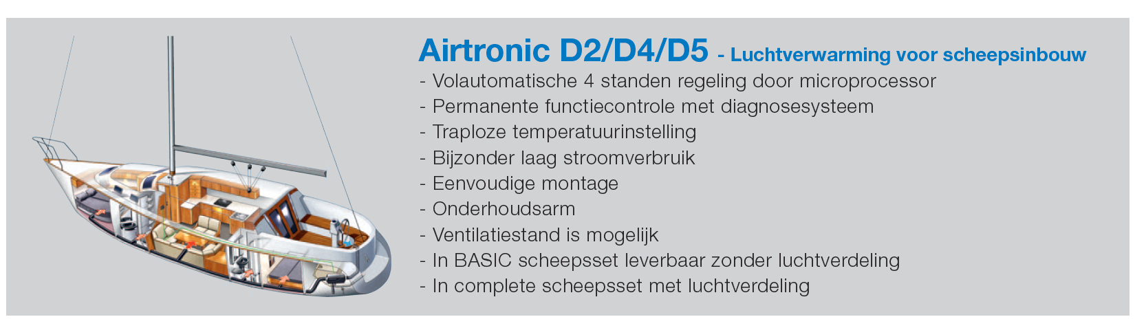 Eberspächer Airtronic D6 Scheepsset. De Airtronic D6 scheepsset is geschikt voor schepen met een lengte van 10 tot 14 meter en een te verwarmen ruimte met een max.van 40 m³.