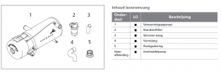 - Leveringsomvang circulatiepomp, bedieningspaneel, uitlaatdeflector en brandstoffilter