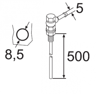 Webasto Tank connection. Ø 5 mm, drill hole Ø 8.5 mm. Length 650 mm. Hooked connection. With banjo eye. Specially for heaters with return connection. Copper stand pipe with aluminum construction part and steel core with nut.