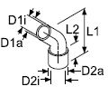 Alternate products for Webasto Molded hose D1i Ø 18 mm, D1a Ø 25 mm, D2i Ø 15 mm, D2a Ø 22 mm. Length 1 = 62 mm, L 2 = 31.5 mm. 45°